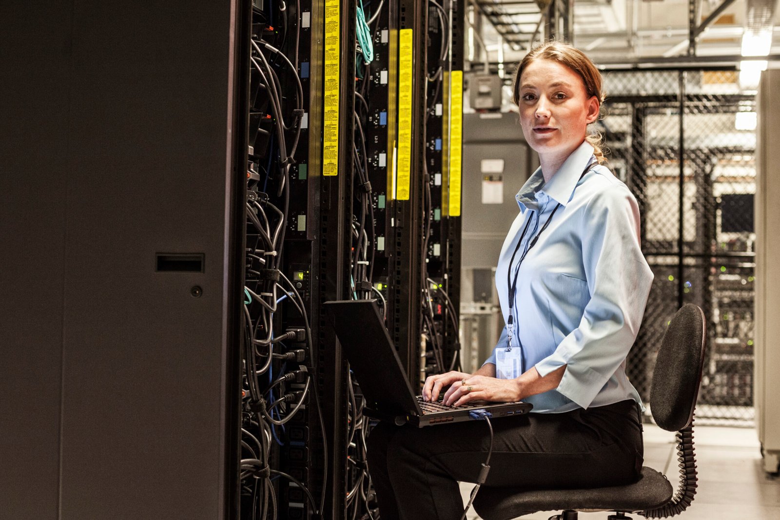 Computer scientists in data center automating routine maintenance tasks with laptop, executing diagnostic scripts. Server farm IT experts doing brainstorming, using device, adjusting power settings